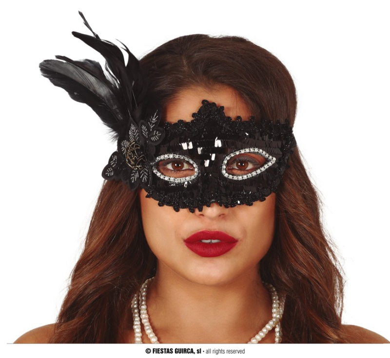 Čierna flitrová maska s perím