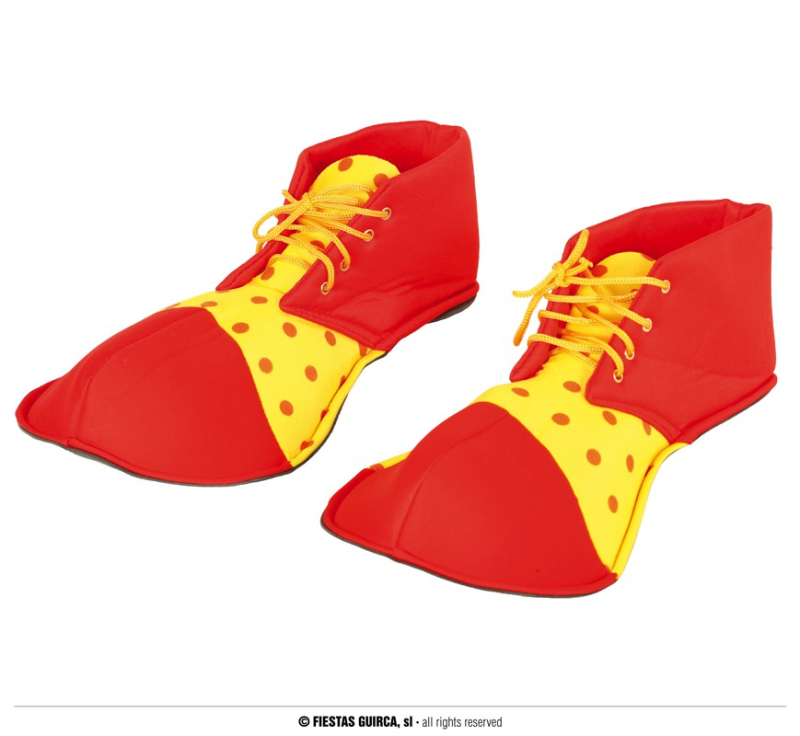 Klaunské červeno-zĺté látkové topánky so šnúrkami. Dĺžka topánok je 36cm. Zobrazit více