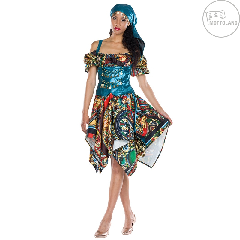 Tričko bez ramienkami, farebne vzorované s krátkym naberaným rukávom a prišitým živôtikom z modrej lesklej tkaniny zdobené retiazky na mincami. Farebná cípatá sukne. Obsahuje šatka s mincami. Zobrazit více