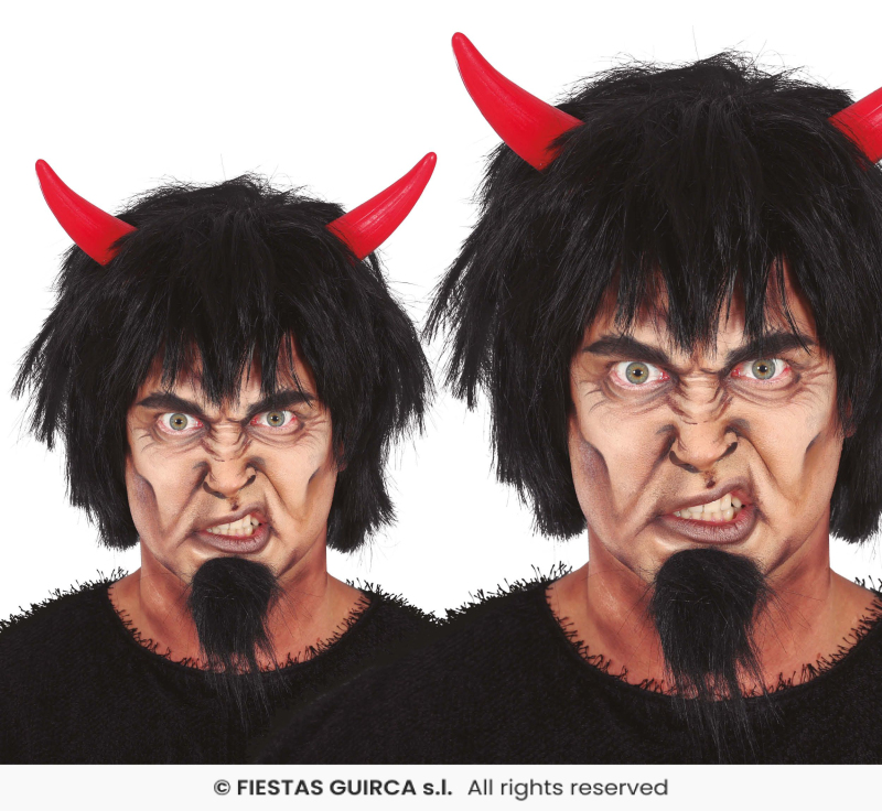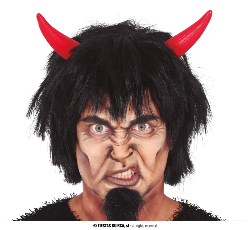 Čiernovlasá parochňa s červenými rohmi. Zobrazit více